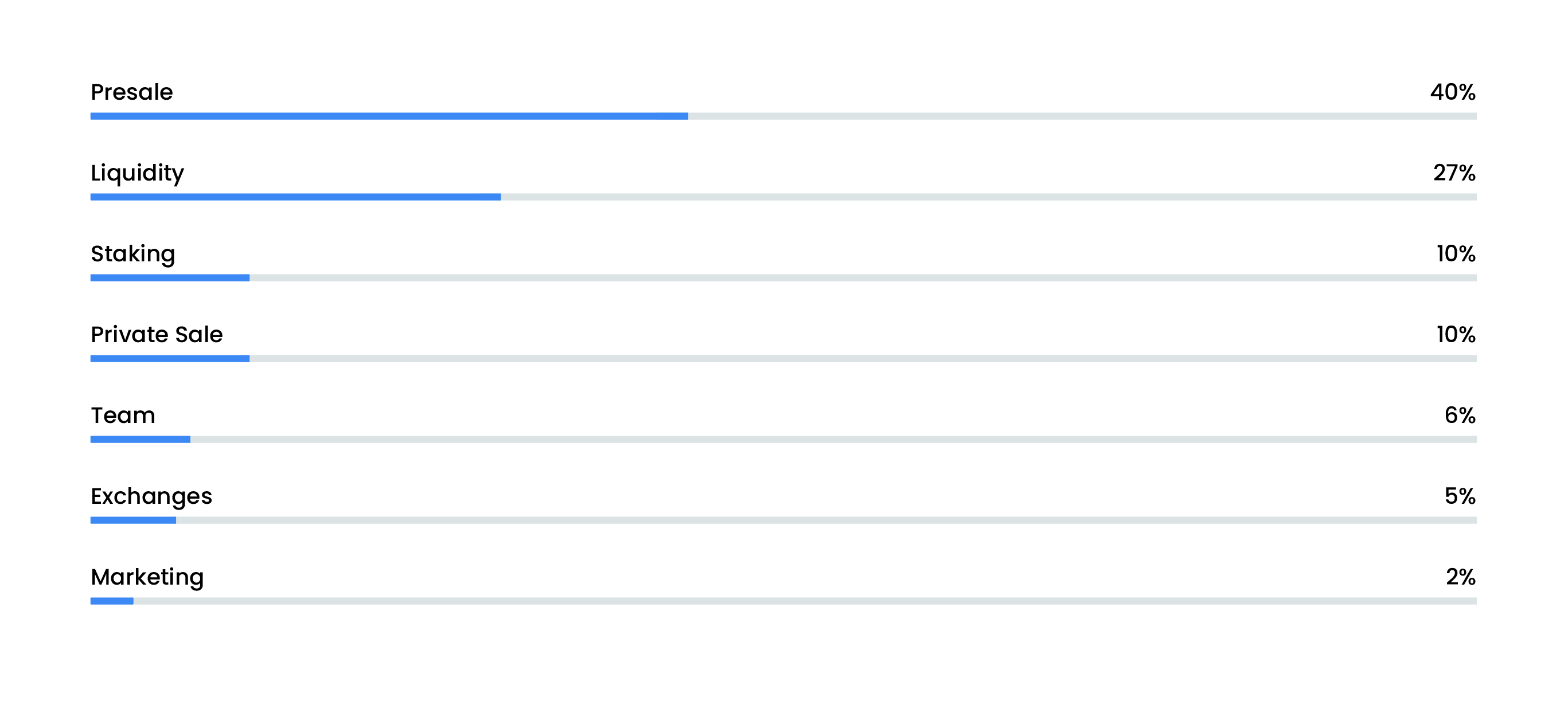 <figure><img src="https://875267692-files.gitbook.io/~/files/v0/b/gitbook-x-prod.appspot.com/o/spaces%2FYhva5oA1jtyFLjJzcsby%2Fuploads%2FPcBydzsU3ljJ646YfGhO%2FScreenshot%202022-10-02%20143311.png?alt=media&#x26;token=20f9755d-336d-4dd3-9d3d-46cb5b908b3b" alt=""><figcaption><p>Presale 40%, Liquidity 27%, Staking 10%, Private Sale 10%, Team 6%, Exchanges 5%, Marketing 2% </p></figcaption></figure>